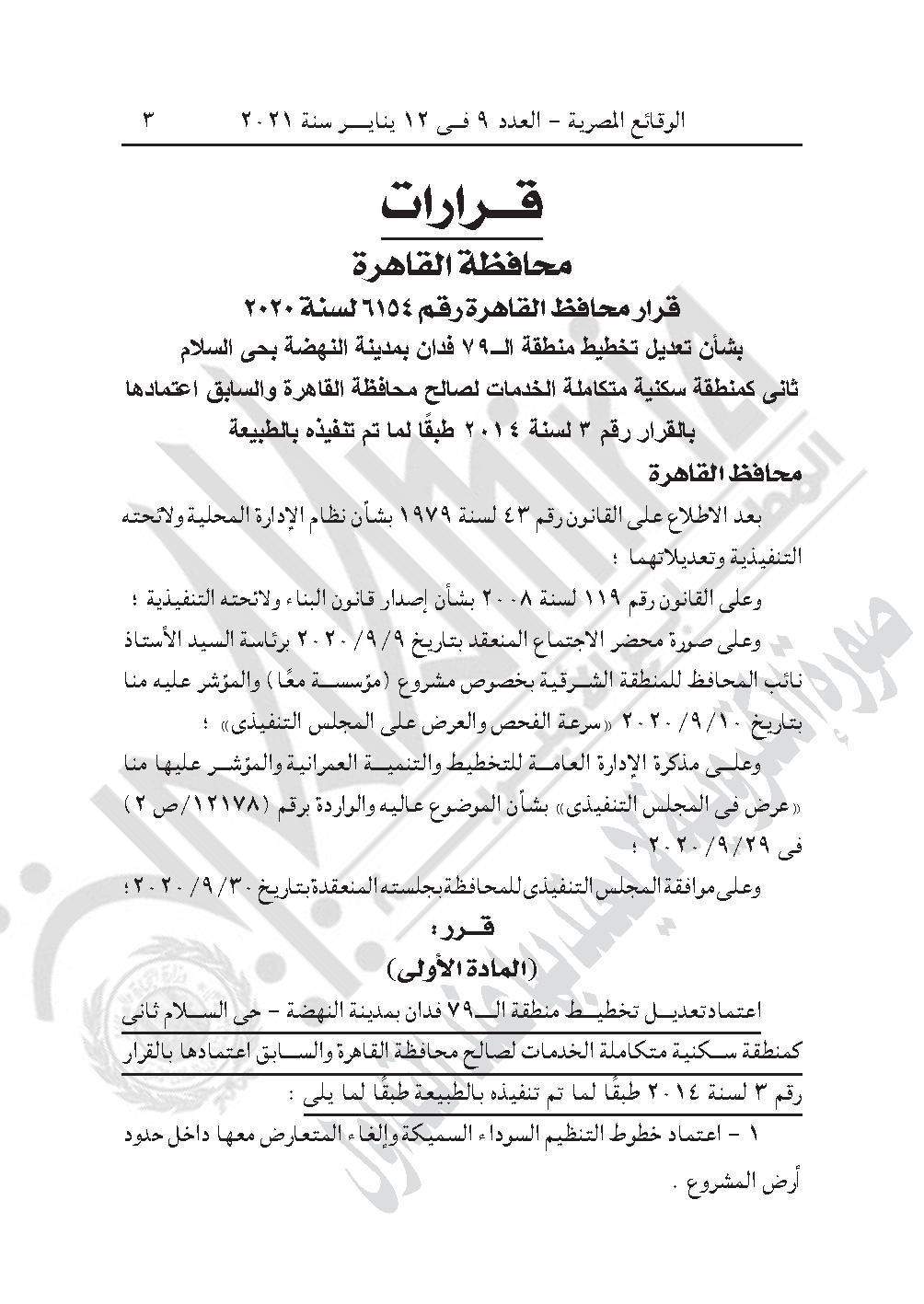 نشرت جريدة الوقائع المصرية في عددها رقم 9، الصادر في 12 يناير 2021، قرار محافظة القاهرة رقم 6154 لسنة 2020، بشأن تعديل تخطيط منطقة 79 فدان بمدينة النهضة بحي السلام ثاني كمنطقة سكنية متكاملة الخدمات لصالح محافظة القاهرة والسابق اعتمادها بالقرار رقم 3 لسنة 2014 طبقًا لما تم تنفيذه بالطبيعة.