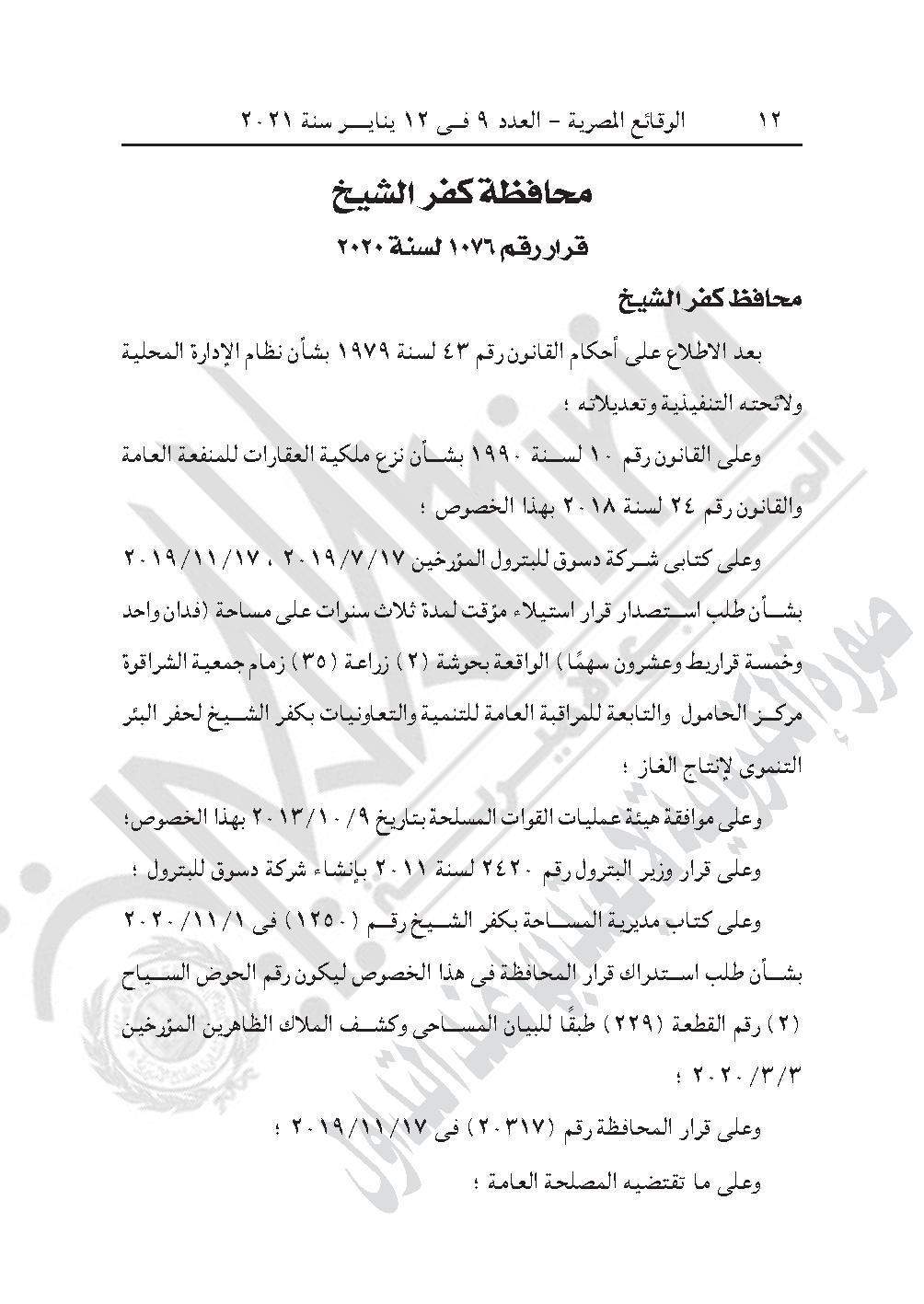نشرت جريدة الوقائع المصرية في عددها رقم 9، الصادر في 12 يناير 2021، قرار محافظة كفر الشيخ رقم 1076 لسنة 2020 بشأن الاستيلاء مؤقتًا لمدة ثلاث سنوات أو بانتهاء الغرض المستولى عليه من أجله على مساحة فدان وخمسة قراريط وعشرون سهمًا، اللازمة لحفر البئر التنموي للإنتاج الغاز بمركز الحامول.