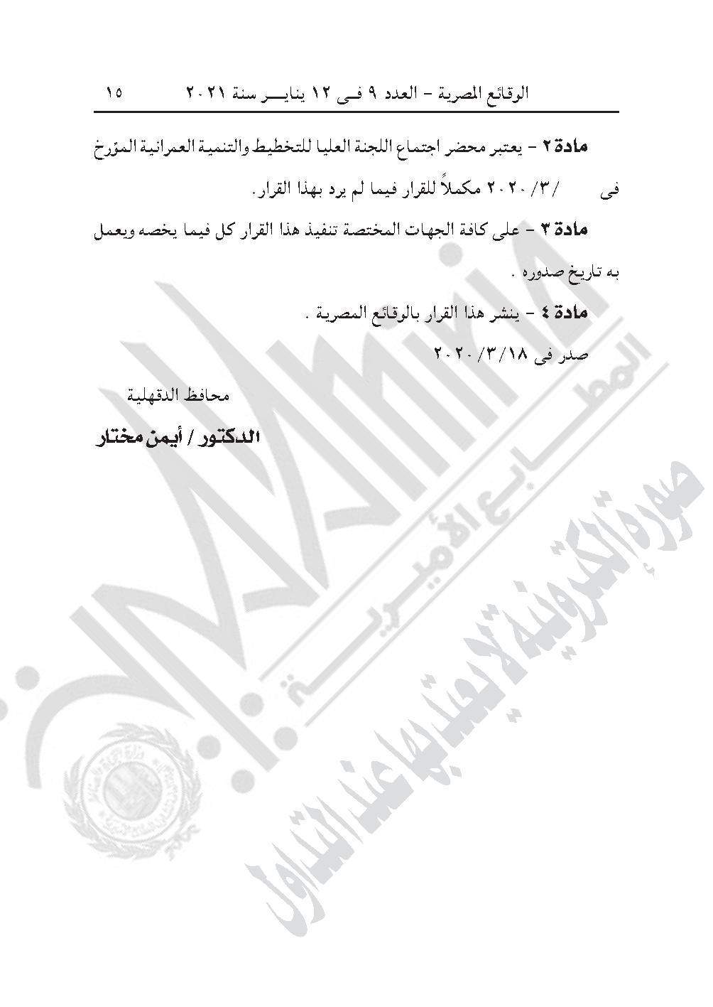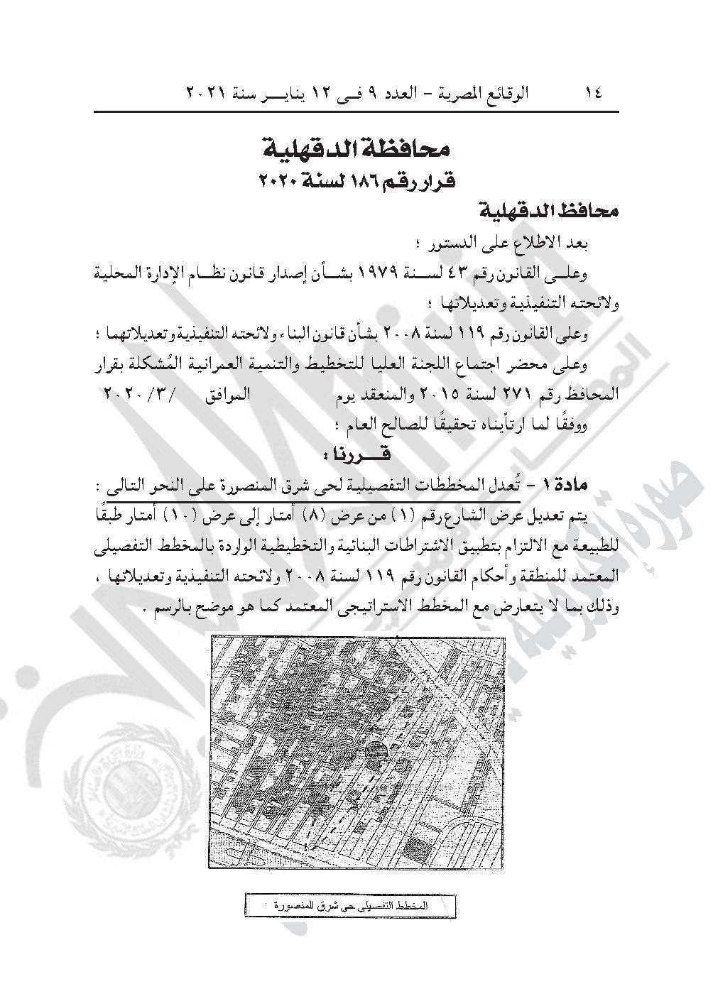 نشرت جريدة الوقائع المصرية في عددها رقم 9، الصادر في 12 يناير 2021، قرار محافظة الدقهلية رقم 186 لسنة 2020، بشأن تعديل المخططات التفصيلية لحي شرق المنصورة.