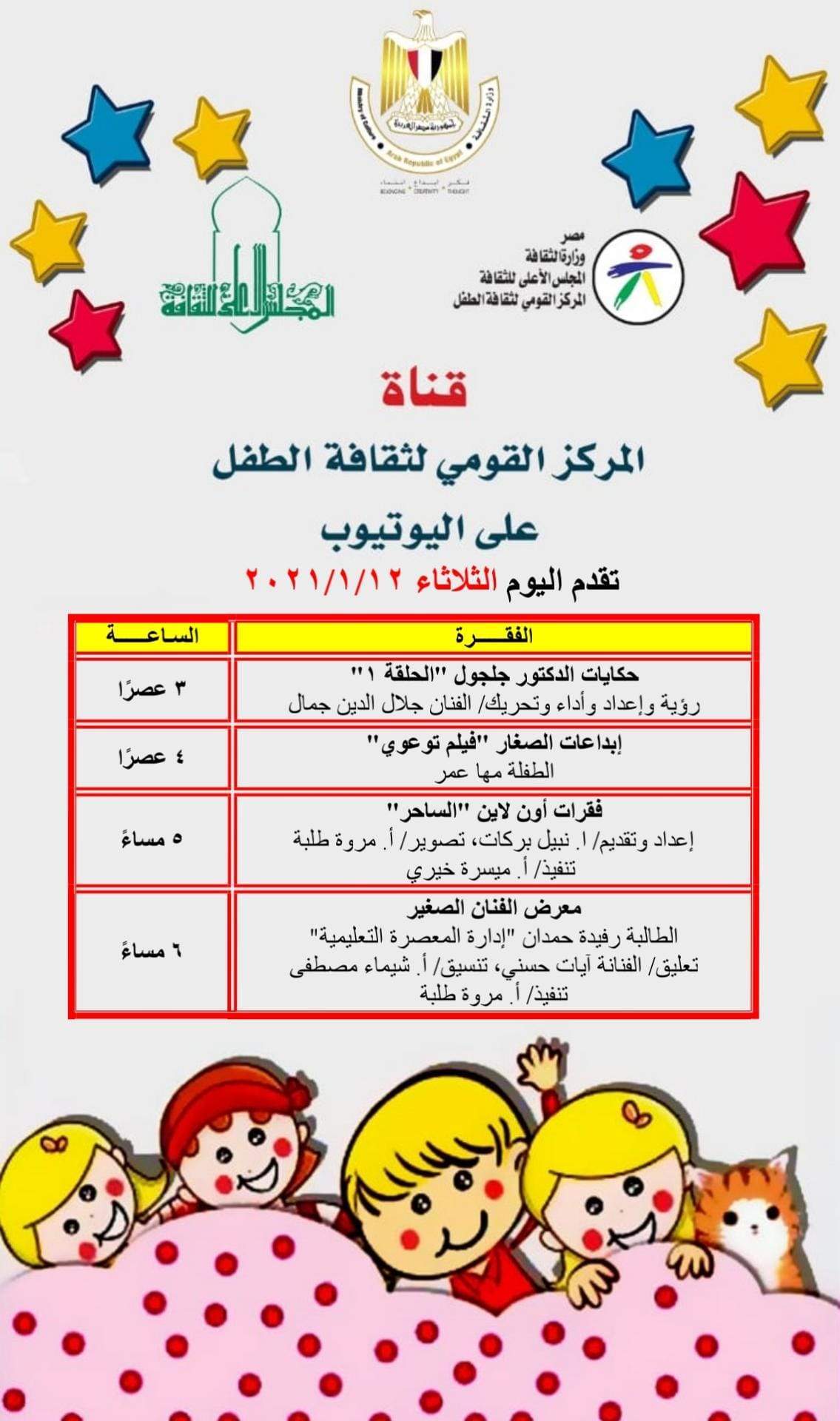 يستكمل المركز القومى لثقافة الطفل، التابع للمجلس الأعلى للثقافة، بأمانة الدكتور هشام عزمي، وبرئاسة الكاتب المسرحي محمد ناصف برنامجه الثقافي والفني للأطفال يوميا عبر قناته الرسمية على يوتيوب.