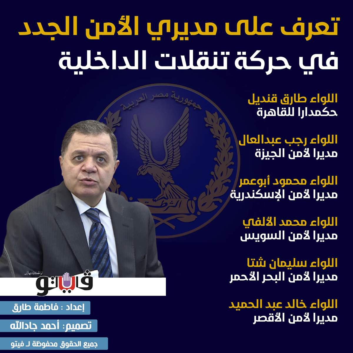 تعرف على مديري الأمن الجدد في حركة تنقلات الداخلية 2021 الثلاثاء 12/يناير/2021 - 02:37 م 1/12/2021 2:37:57 PM أرشيفية فاطمة طارق شارك طباعة 18 حجم الخط شارك طباعة حركة تنقلات الداخلية اللواء سليمان شتا اللواء رجب عبدالعال اللواء طارق قنديل اللواء محمد الالفي اللواء محمود ابوعمر