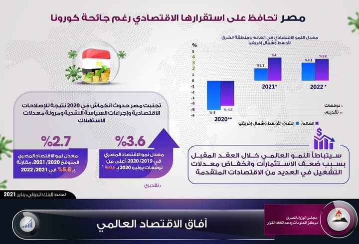 ويذكر أنه في يونيو 2020 كان البنك الدولي قد توقع نموا اقتصاديا لمصر في عام 2019/ 2020 يصل إلى 3%، إلا أنه قد رفع توقعاته للعام نفسه لتصل إلى 3.6%.