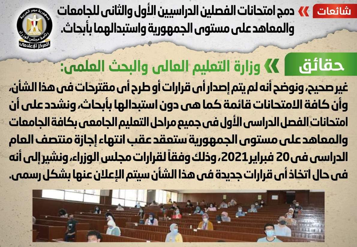 وقد قام المركز الإعلامي لمجلس الوزراء بالتواصل مع وزارة التعليم العالي والبحث العلمي، والتي نفت تلك الأنباء، مُؤكدةً أنه لا صحة لدمج امتحانات الفصلين الدراسيين الأول والثاني للجامعات واستبدالهما بأبحاث.