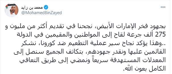 وكتب الشيخ محمد بن زايد :" بجهود فخر الإمارات الأبيض، نجحنا في تقديم أكثر من مليون و 275 ألف جرعة لقاح إلى المواطنين والمقيمين في الدولة .. وهذا يؤكد نجاح سير عملية التطعيم ضد كورونا، نشكر القائمين عليها ونقدر جهودهم، بتكاتف الجميع سنصل إلى المعدلات المستهدفة سريعاً ونمضي إلى طريق التعافي الكامل بعون الله"
