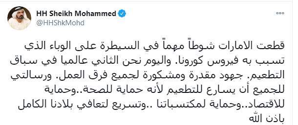 وكتب الشيخ محمد بن راشد آل مكتوم تغريدة على تويتر قال فيها: "قطعت الامارات شوطاً مهماً في السيطرة على الوباء الذي تسبب به فيروس كورونا. واليوم نحن الثاني عالميا في سباق التطعيم. جهود مقدرة ومشكورة لجميع فرق العمل. ورسالتي للجميع أن يسارع للتطعيم لأنه حماية للصحة.. وحماية للاقتصاد.. وحماية لمكتسباتنا ..وتسريع لتعافي بلادنا الكامل باذن الله".