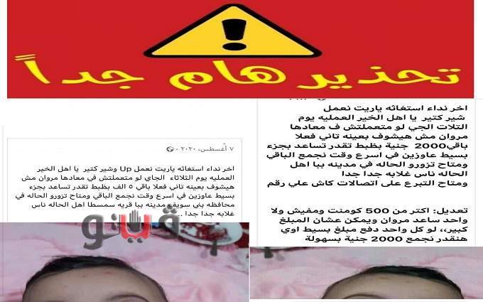 وأضاف البيان، أنه بمعاودة الاتصال بنفس الرقم مرة أخرى وجد أن التليفون مغلق باستمرار وقد تمت مراجعة البوست وتبين أنه قد تم نشره بتاريخ سابق في شهر أغسطس العام الماضي، وتم إعادة نشره مجدداً، حيث تم التأكد من أن البوست بغرض استغلال المواطنين واللعب على الجانب الإنساني والعاطفي بهدف المتاجرة والتربح بطرق غير شرعية تخالف القانون.