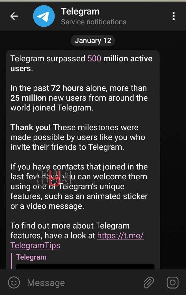 وفي مدونة على قناته في تليجرام، قال بافيل دوروف إنه في الأسبوع الأول من يناير، تجاوز مستخدمو تليجرام الـ500 مليون مستخدم نشط شهريا.