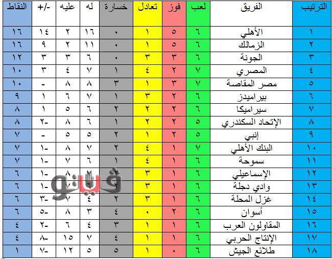 وجاء ترتيب باقي الأندية على النحو الموضح بالجدول: