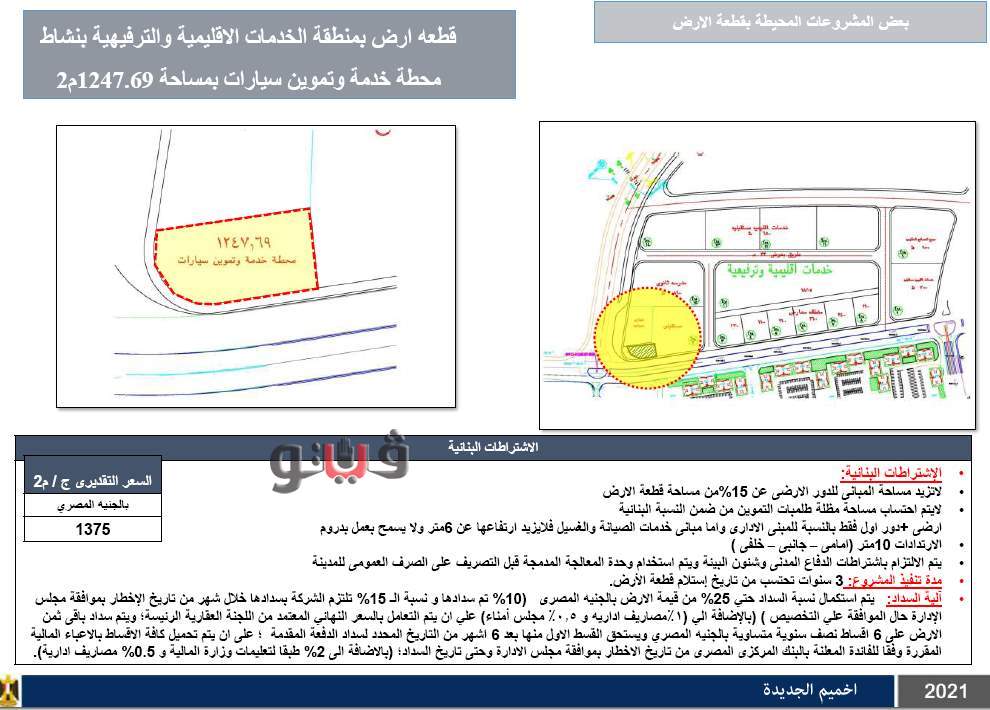 وتطرح أرضا بمساحة 1148 مترا بنشاط مستودع مواد بناء بسعر 2775 جنيها، وأرضا بمساحة 5780 مترا بنشاط مدرسة بسعر 1435 جنيها للمتر، وأرضا بنشاط تجاري بمساحة 213 مترا بسعر 4230 جنيها للمتر، وتطرح أرضا بمساحة 3474 بنشاط تجاري بسعر 2945 جنيها للمتر.
