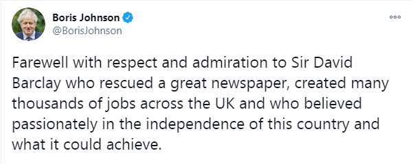 وكتب بوريس جونسون تغريدة على تويتر "الوداع مع الاحترام والإعجاب للسير ديفيد باركلي الذي أنقذ صحيفة كبيرة، وخلق عدة آلاف من الوظائف في جميع أنحاء المملكة المتحدة، وآمن بشدة باستقلال هذا البلد وما يمكن أن يحققه"