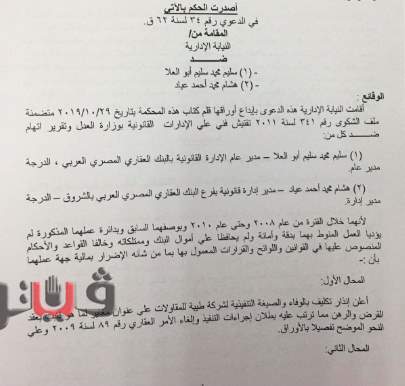 وتبين من أوراق القضية أن هشام محمد أحمد، مدير الإدارة القانونية بالبنك لم يرتكب مخالفة بشأن طلب إستصدار أمر بتعيين وكيل عقاري، وذلك بإثبات عنوان مغاير وعدم تقديمه مستندات بدفاع البنك إلا بعد فوات المواعيد، مما ترتب عليه بطلان اجراءات التنفيذ