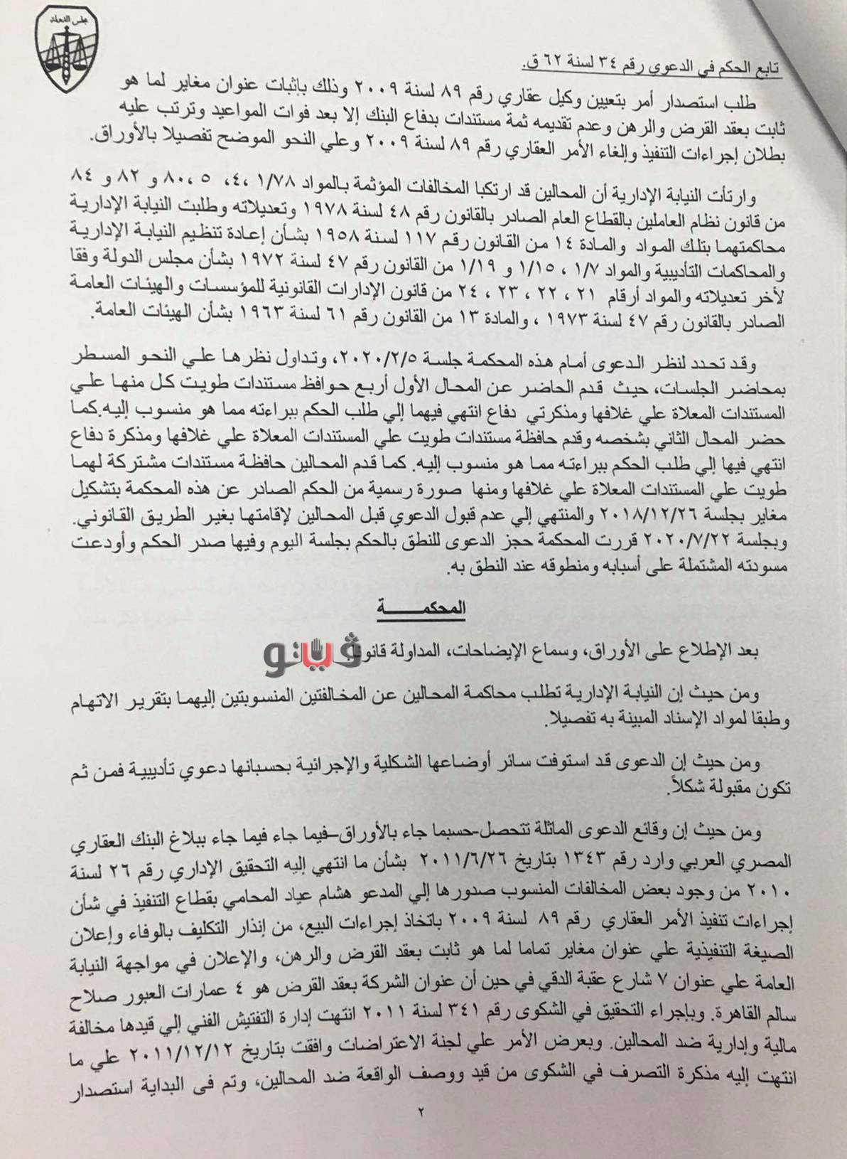 أصدرت المحكمة التأديبية العليا بمجلس الدولة حكمها في القضية رقم 34 لسنة 62 قضائية عليا ببراءة مسئولين من القيادات القانونية بالبنك العقاري المصري العربي بعد ثبوت عدم ارتكابهما مخالفات مالية أو إدارية أو قانونية جسيمة ترتب عليها الإضرار بالمال العام.