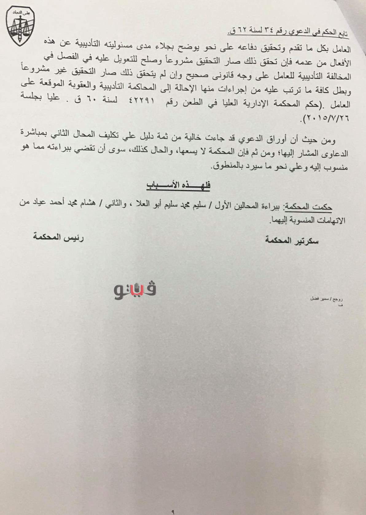 جـاء ذلك في مذكرة أرسلها رئيس قطاع شئون مكتب الوزيرة إلى مساعد وزير العدل لشئون الإدارات القانونية ردًا على خطابه رقم 672 المؤرخ في 13 فبراير 2019 بشأن موافقة الوزيرة على طلب وزارة العدل على إحالتهما للمحكمة التأديبية العليا التي أصدرت حكمها المتقدم بالبراءة