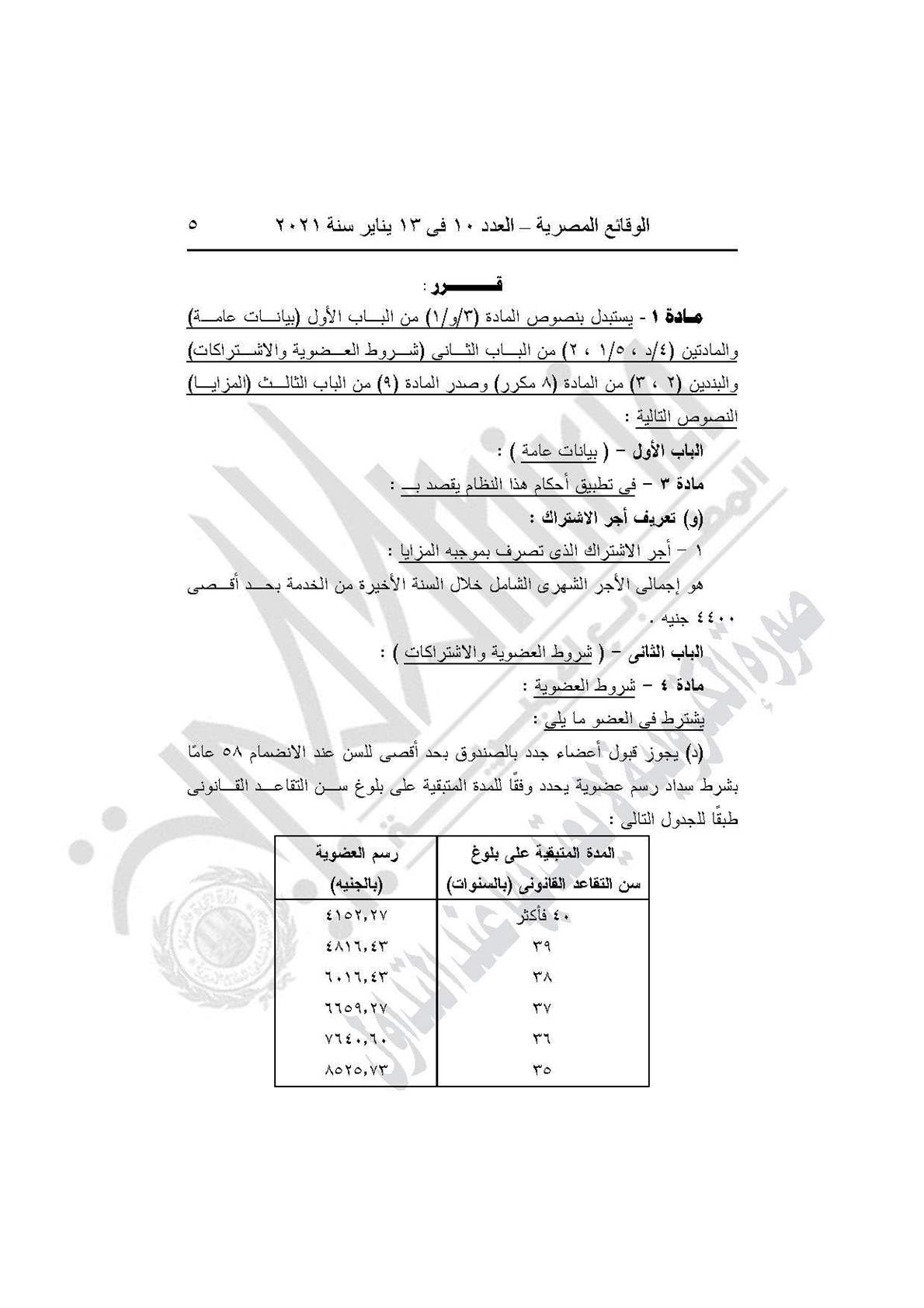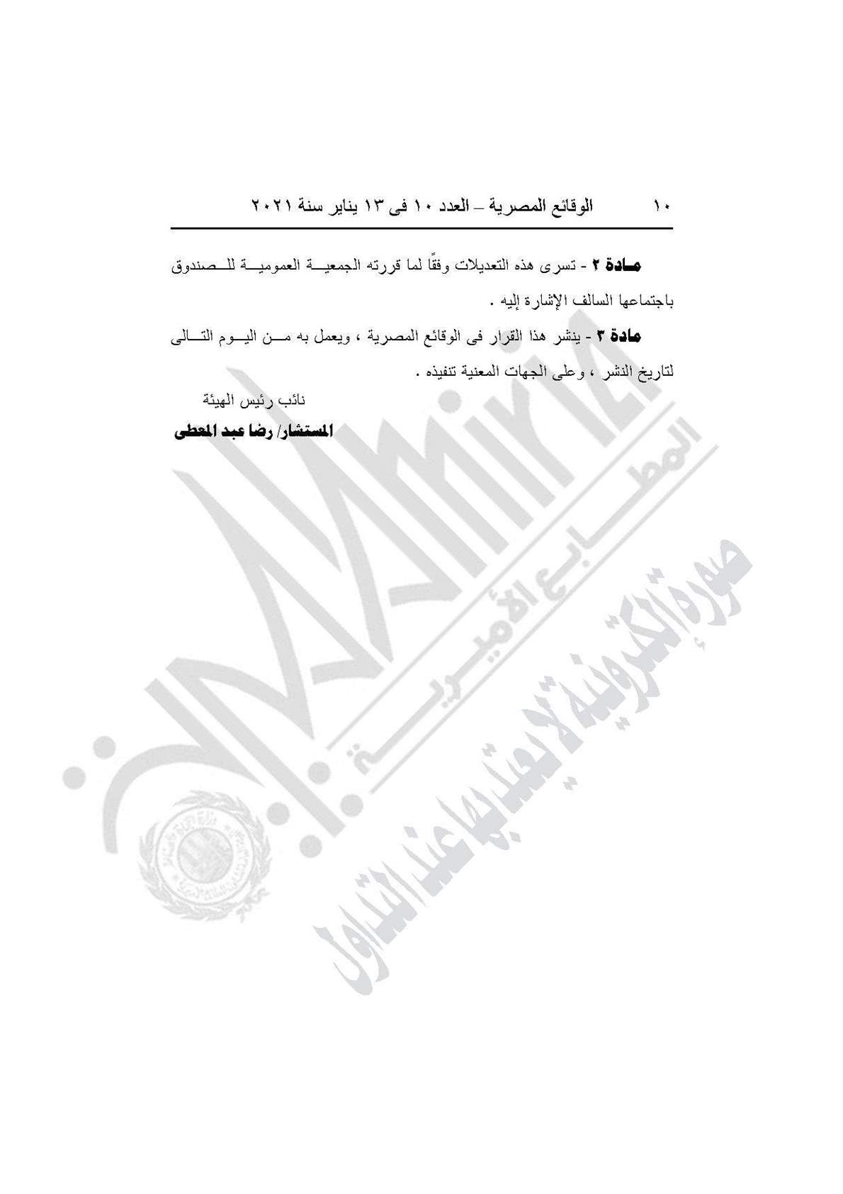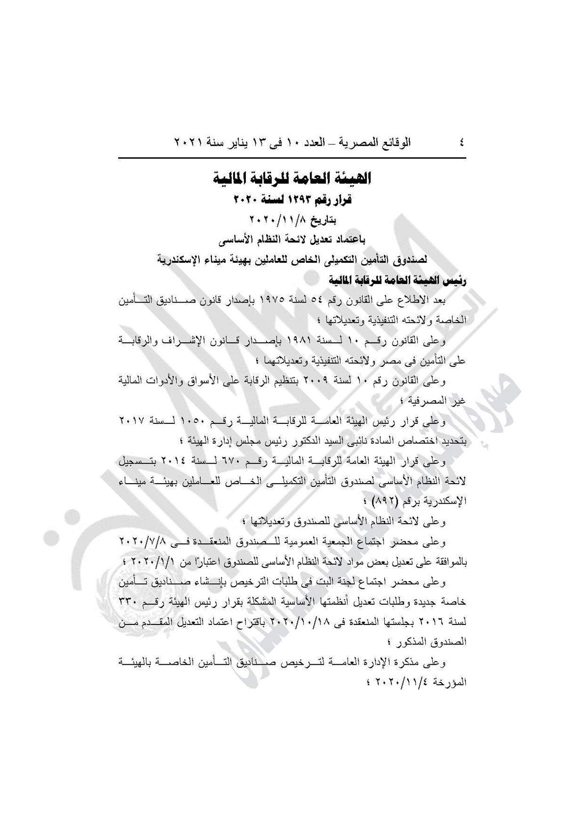 نشرت جريدة الوقائع المصرية في عددها رقم 10، الصادر في 13 يتاير 2021، 3 قرارات للهيئة العامة للرقابة المالية بشأن اعتماد تعديل لائحة النظام الأساسى لصندوق التأمين للعاملين بهيئة ميناء الإسكندرية، والهيئة العامة للأبنية التعليمية، وبالشركة المصرية للسبائك الحديدية.