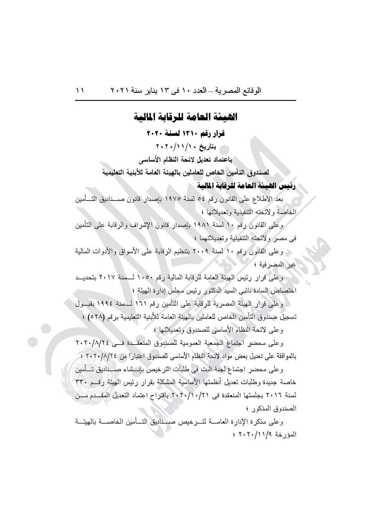 والقرار رقم 1310 لسنة 2020، باعتماد تعديل لائحة النظام الأساسى لصندوق التأمين الخاص للعاملين بالهيئة العامة للأبنية التعليمية.