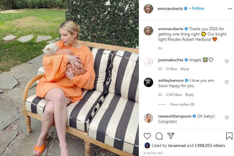 وعلقت إيما على الصورة بما معناه: "شكراً 2020 على إعطائنا شيئاً جيداً، نورنا الساطع رودس روبرت هيدلوند".