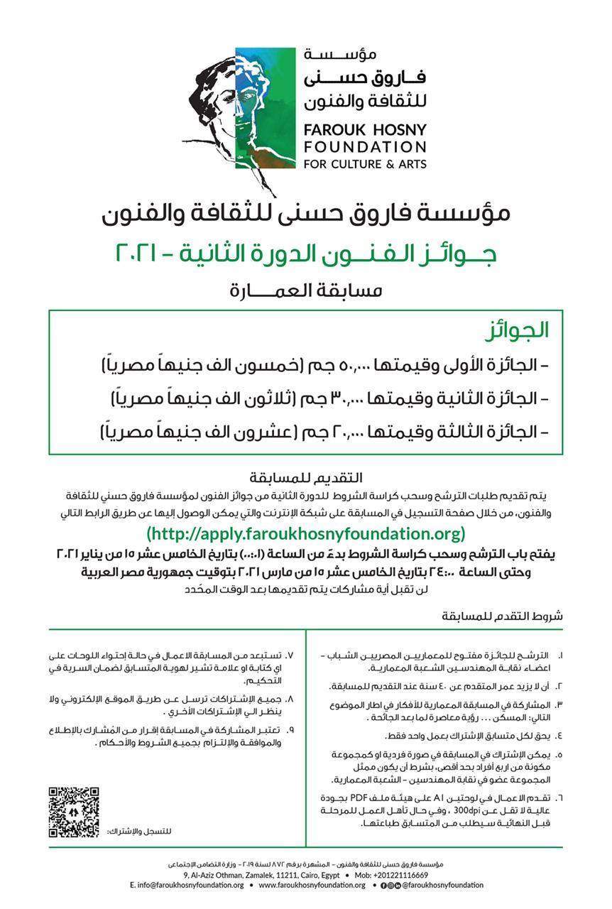 أعلنت مؤسسة فاروق حسني للثقافة والفنون فتح باب الترشح لمسابقات جوائز الفنون - الدورة الثانية ٢٠٢١ فى مجالي التصوير الفوتوغرافي – العمارة، و ذلك اعتبارا من 15 يناير 2021 .
