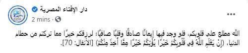 وكتبت دار الإفتاء المصرية تدوينة على الفيس بوك "الله مطلع على قلوبكم، فلو وجد فيها إيمانًا صادقًا وقلبًا صافيًا؛ لرزقكم خيرًا مما تركتم من حطام الدنيا، ﴿إِنْ يَعْلَمِ اللَّهُ فِي قُلُوبِكُمْ خَيْرًا يُؤْتِكُمْ خَيْرًا مِمَّا أُخِذَ مِنْكُمْ﴾ [الأنفال: 70].