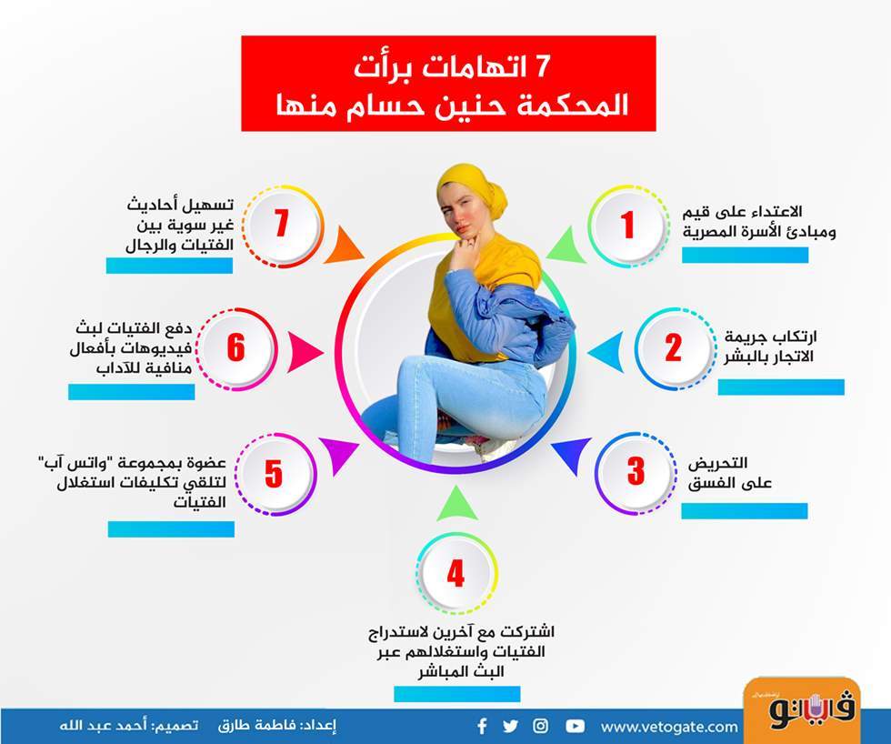 7 اتهامات برأت المحكمة حنين حسام منها | إنفوجراف الأربعاء 13/يناير/2021 - 08:51 م 1/13/2021 8:51:43 PM أرشيفية فاطمة طارق شارك طباعة 18 حجم الخط شارك طباعة واتس اب الاتجار بالبشر البث المباشر حنين حسام التيك توك الفسق أفعال منافية للآداب