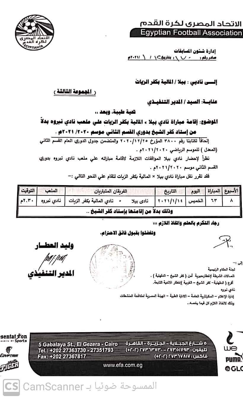 وأكد إتحاد الكرة ، في خطاب رسمي لنادي بيلا ونظيره مالية كفر الزيات ،إقامة مباراة الفريقين بملعب نبروه بدلا من إستاد كفر الشيخ بعد حصول بيلا علي الموافقات الأمنية لإقامة اللقاء بـ "نبروه".