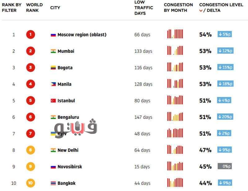 وبينما انتعشت مستويات حركة المرور في العديد من الأماكن، فقد كان لدى موسكو أعلى مستوى ازدحام بنسبة 54%، وهذا يعني أن رحلة مدتها 30 دقيقة ستستغرق وقتاً أطول بنسبة 54% مما هي عليه في الظروف غير المزدحمة في موسكو، وتليها مومباي وبوغوتا ومانيلا، حيث بلغ مستوى الازدحام في المدن الثلاث 53%، وجاءت اسطنبول في المركز الخامس بنسبة 51%.