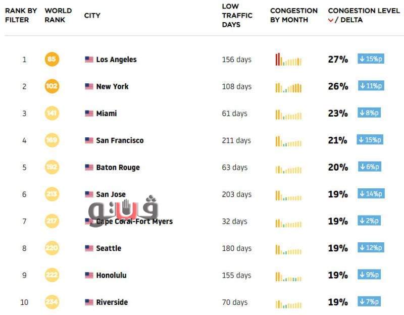 وفي الولايات المتحدة، جاءت لوس أنجلوس في المركز الأول بنسبة 27%، وبينما تشتهر المدينة بازدحامها، إلا أنها تحتل المرتبة 85 على مستوى العالم، في حين تأتي نيويورك بنسبة 26%، ثم ميامي بـ 23%، وسان فرانسيسكو 21%، وباتون رود 20%، أما بالنسبة للانخفاض، فقد انخفض الزحام في المدن بنسبة 15% في كل من لوس أنجلوس وسان فرانسيسكو.
