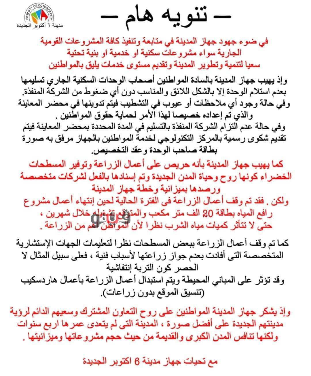 وتقدم جهاز مدينة 6 أكتوبر الجديدة بعدد من النصائح للمواطنين الحاجزين لشقق وزارة الإسكان ، بعدم استلام الوحدة إلا بالشكل اللائق والمناسب دون أى ضغوط من الشركة المنفذة، وفى حالة وجود أى ملاحظات أو عيوب فى التشطيب يتم تدوينها فى محضر المعاينة والذى تم اعداده لحماية حقوق المواطنين.