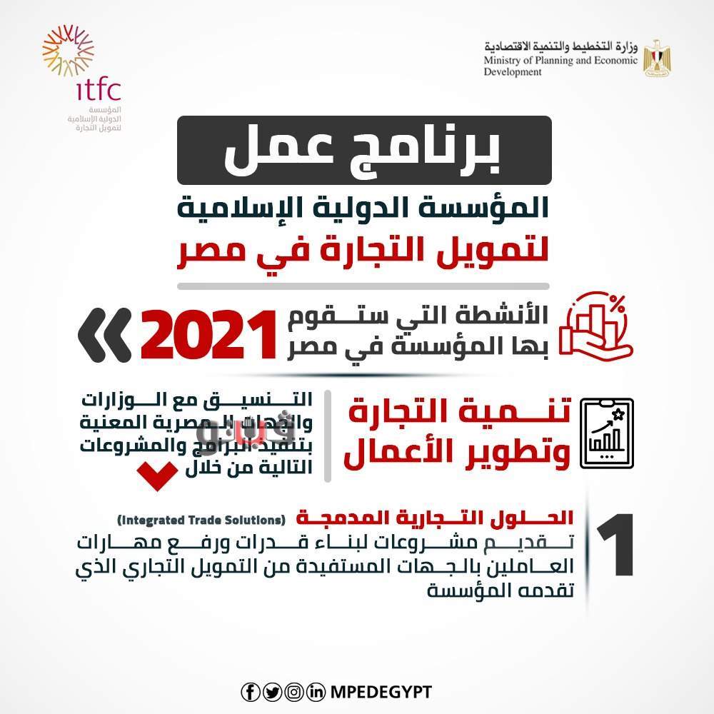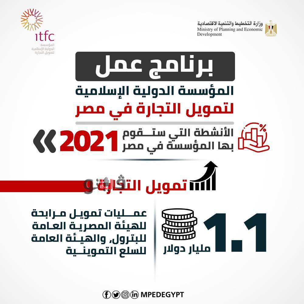 وهناك مجموعة من الأنشطة التي تعتزم المؤسسة القيام بها في مصر خلال 2021، والتي تأتي في ضوء الاتفاقية الإطارية التي تم توقيعها بين مصر والمؤسسة في 2018 لفترة خمس سنوات بحد ائتماني يبلغ 3 مليارات دولار أمريكي، واتفاقيتي المرابحة الإطارية اللتين تم توقيعهما بين المؤسسة وكل من الهيئة المصرية العامة للبترول والهيئة العامة للسلع التموينية في ذات العام.