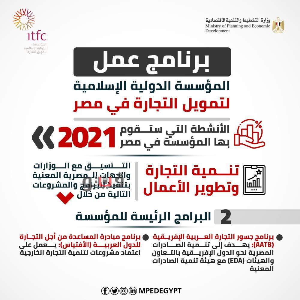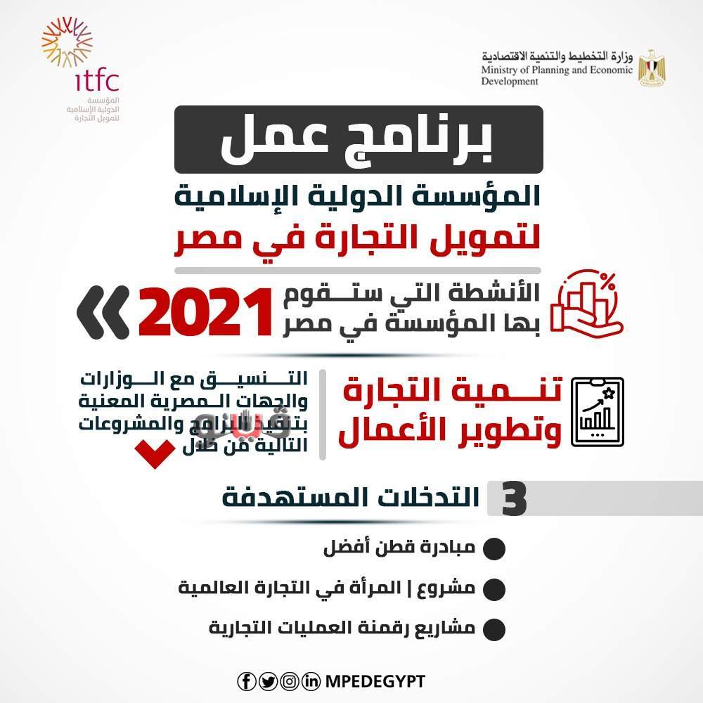 أعلنت وزارة التخطيط والتنمية الاقتصادية عن تفاصيل برنامج عمل المؤسسة الدولية الإسلامية لتمويل التجارة في مصر لعام 2021، والذي تم توقيعه بالأمس بحضور وزراء التخطيط والتنمية الاقتصادية، والبترول والثروة المعدنية، والتموين والتجارة الداخلية، والتعاون الدولي، والتجارة والصناعة، وقام بالتوقيع المهندس هاني سالم سنبل، الرئيس التنفيذي للمؤسسة الدولية الإسلامية لتمويل التجارة.