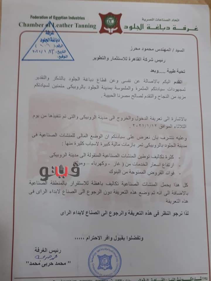 وقال الخطاب المرسل من الغرفة والذى حصلت "فيتو" على نسخة منه: إن الوضع المالى للمنشآت الصناعية فى مدينة الروبيكى يمر بأزمات مالية كثيرة منها "كثرة تكاليف توطين المنشآت الصناعية المنقولة إلى الروبيكي- ارتفاع أسعار الخامات والطاقة من غاز وكهرباء ومياه- أعباء سداد فوائد القروض الممنوحة من البنوك".