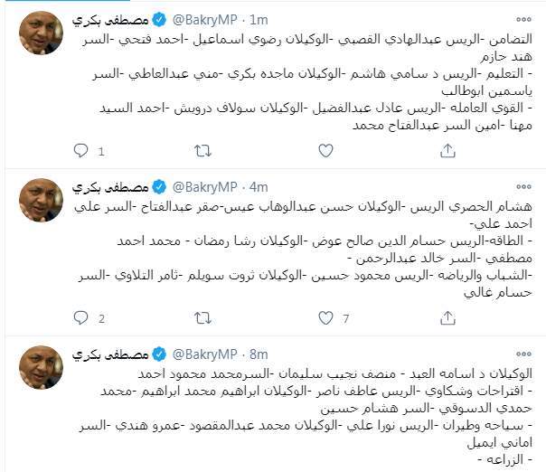 توقع النائب مصطفي بكري، عضو مجلس النواب، على صفحته على موقع "تويتر"، أن تضم ترشيحات مستقبل وطن وقوى التحالف للجان النوعية التي سيجري انتخاب هياكلها، اليوم الخميس، رئيس لجنة الشئون العربية يسري المغازي، أما الوكيلان فسيكونان عباس السادات وأحمد فؤاد أباظة.