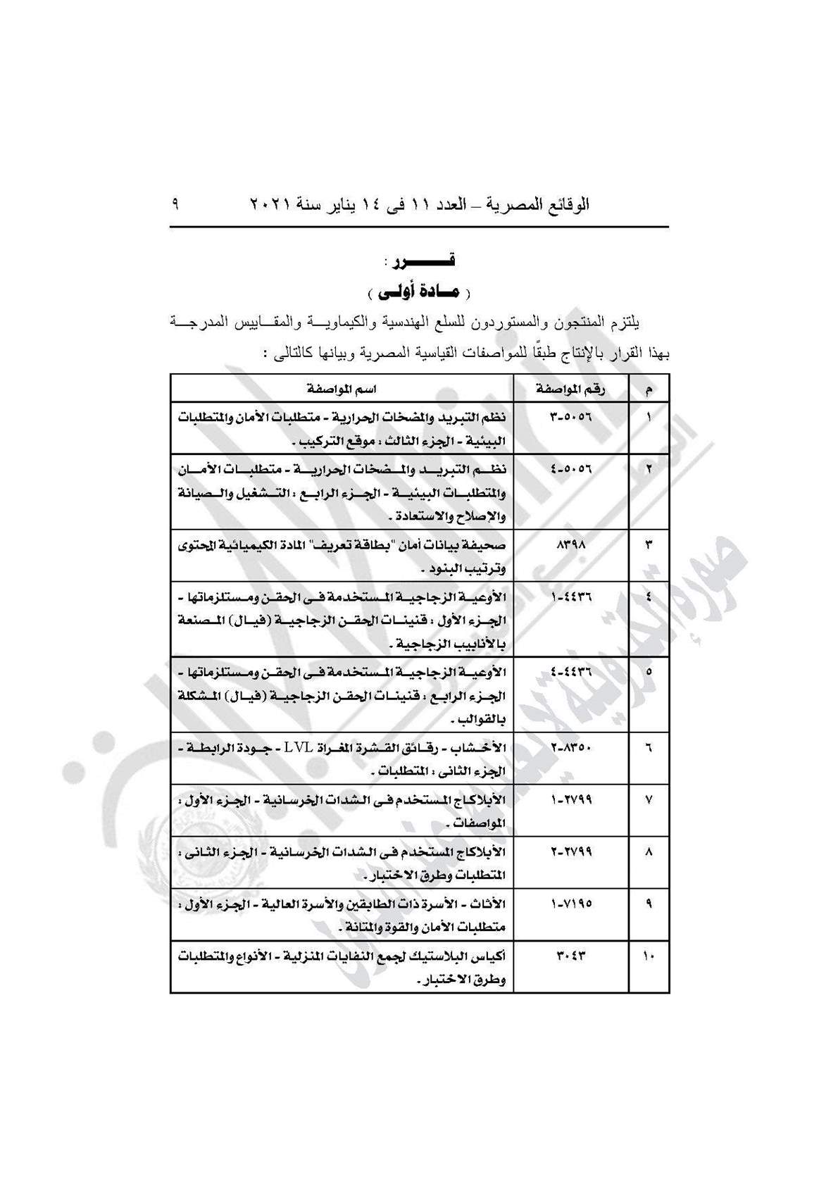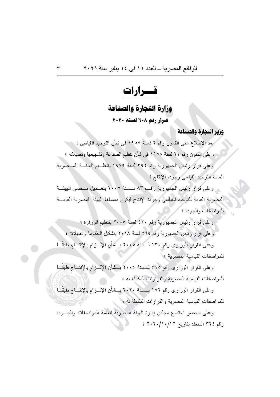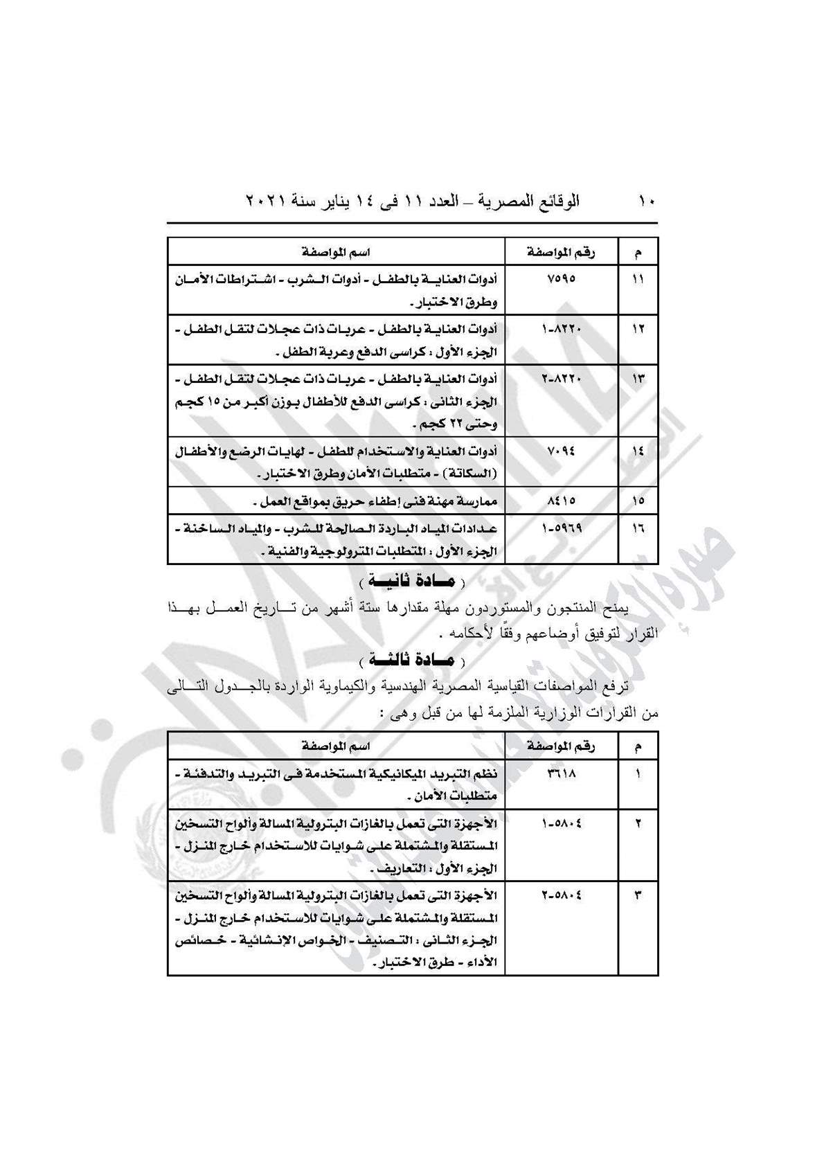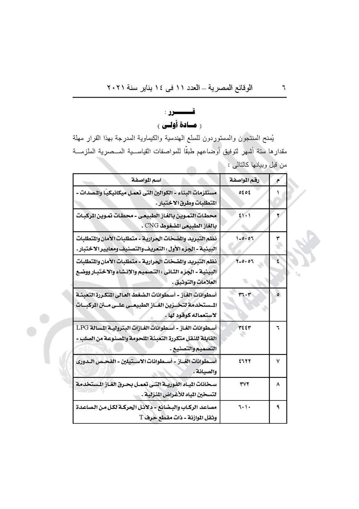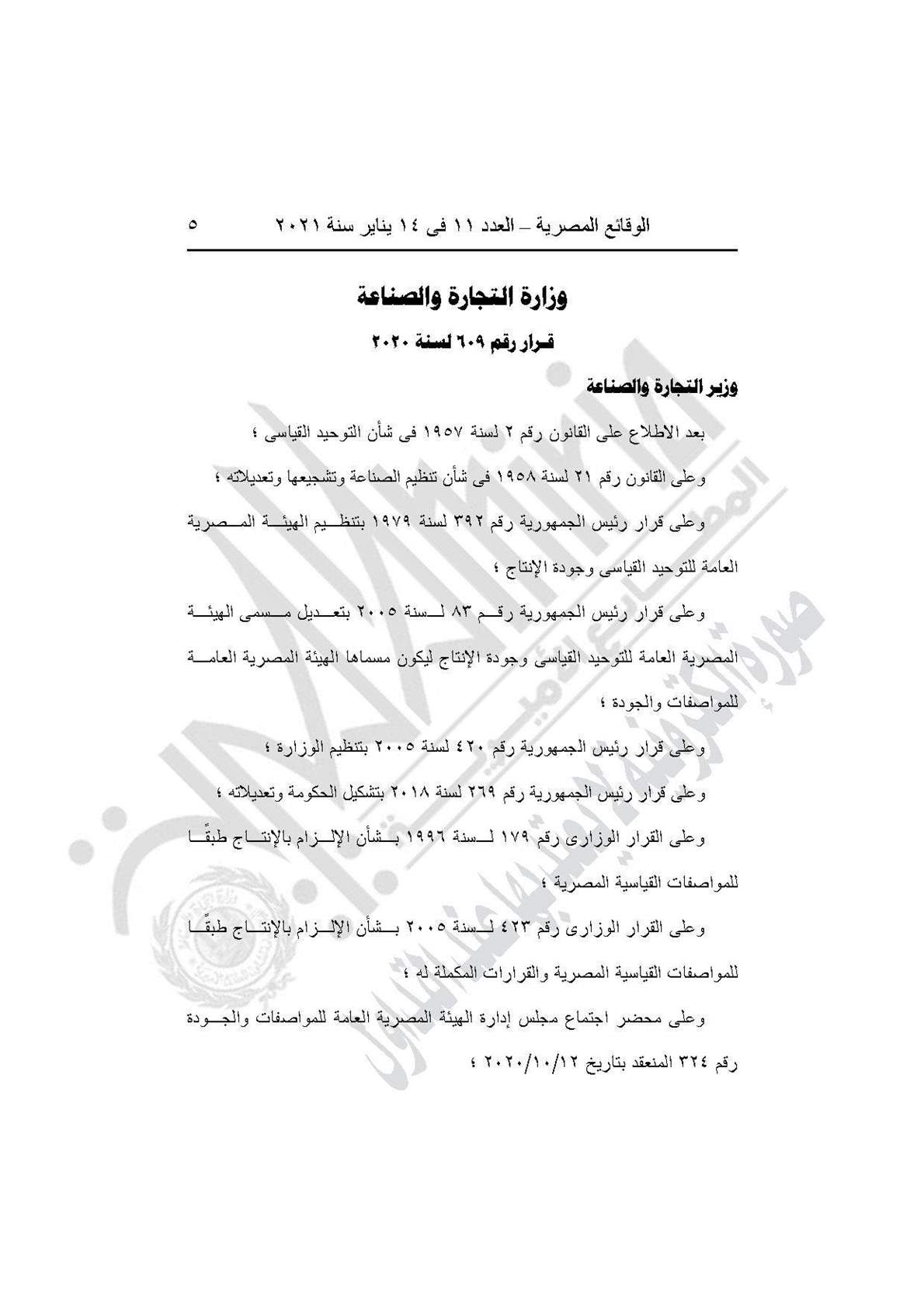 والقرار رقم 609 لسنة 2020، بمنح المنتجين والمستوردين للسلع الهندسية والكيماوية المدرجة بالقرار مهلة 6 أشهر لتوفيق أوضاعهم طبقًا للمواصفات القياسية المصرية.