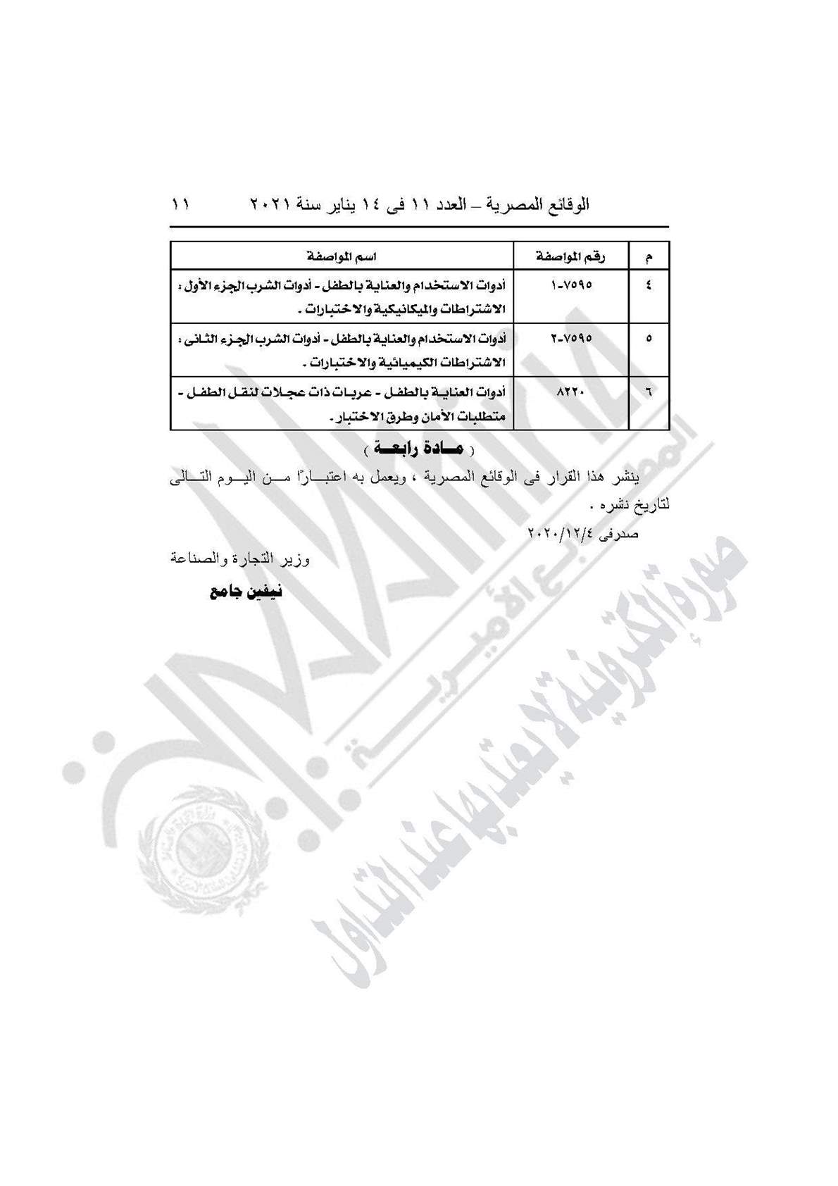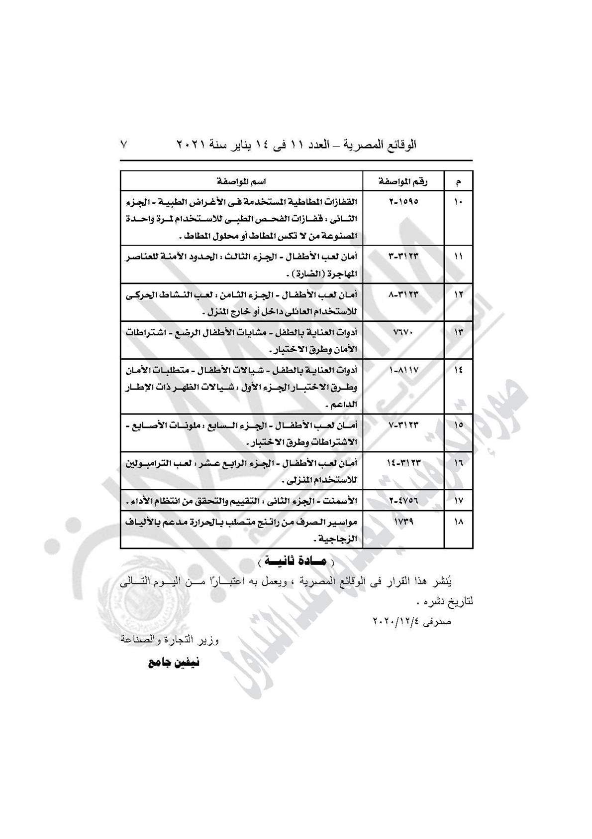 والقرار رقم 621 لسنة 2020، بتعديل اسم المواصفة رقم (3123-14) الواردة بالمادة الأولى مسلسل رقم (16) من القرار الوزارى رقم 609 لسنة 2020 المشار إليه ليكون بيانها كالآتى (أمان لعب الأطفال- الجزء الرابع عشر: لعب الترامبولين للاستخدام المنزلى).