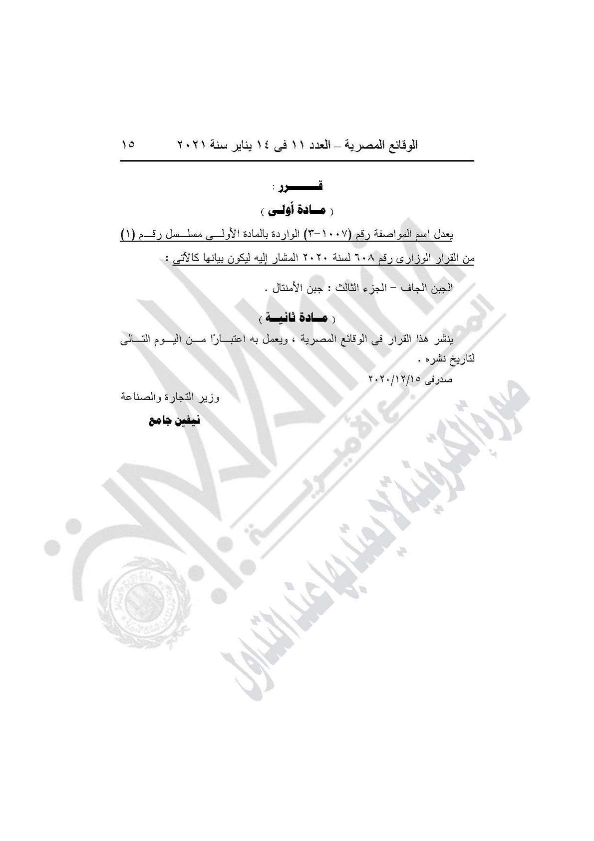 والقرار رقم 620 لسنة 2020، بتعديل اسم المواصفة رقم (1007-3) الواردة بالمادة الأولى مسلسل رقم (1) من القرار الوزارى رقم 608 لسنة 2020 المشار إليه ليكون بيانها كالآتى (الجبن الجاف الجزء الثالث: جبن الأمنتال).