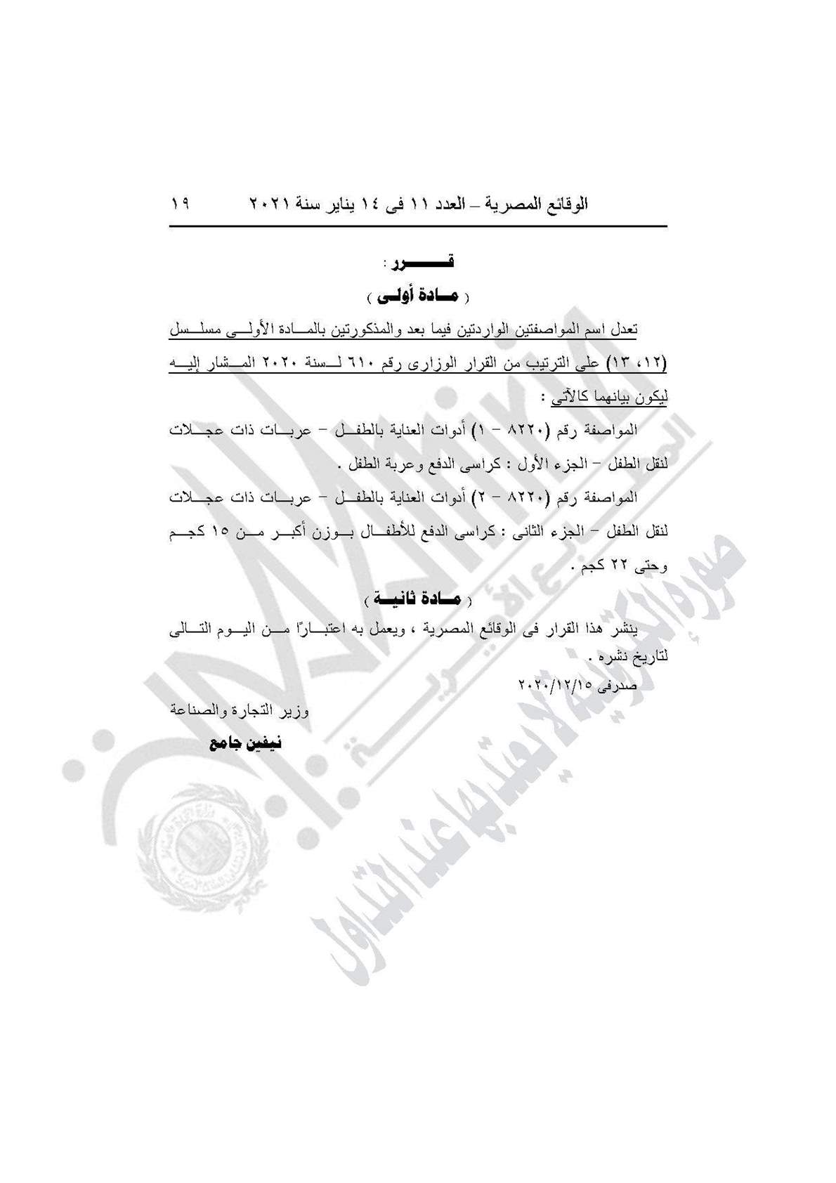 والقرار رقم 622 لسنة 2020، تعدل اسم المواصفتين الواردتين فيما بعد والمذكورتين بالمادة الأولى مسلسل (12، 13) على الترتيب من القرار الوزارى رقم 610 لسنة 2020 المشار إليه ليكون بيانهما كالآتى(أدوات العناية بالطفل، عربات ذات عجلات لنقل الطفل، كراسي الدفع وعربة الطفل)