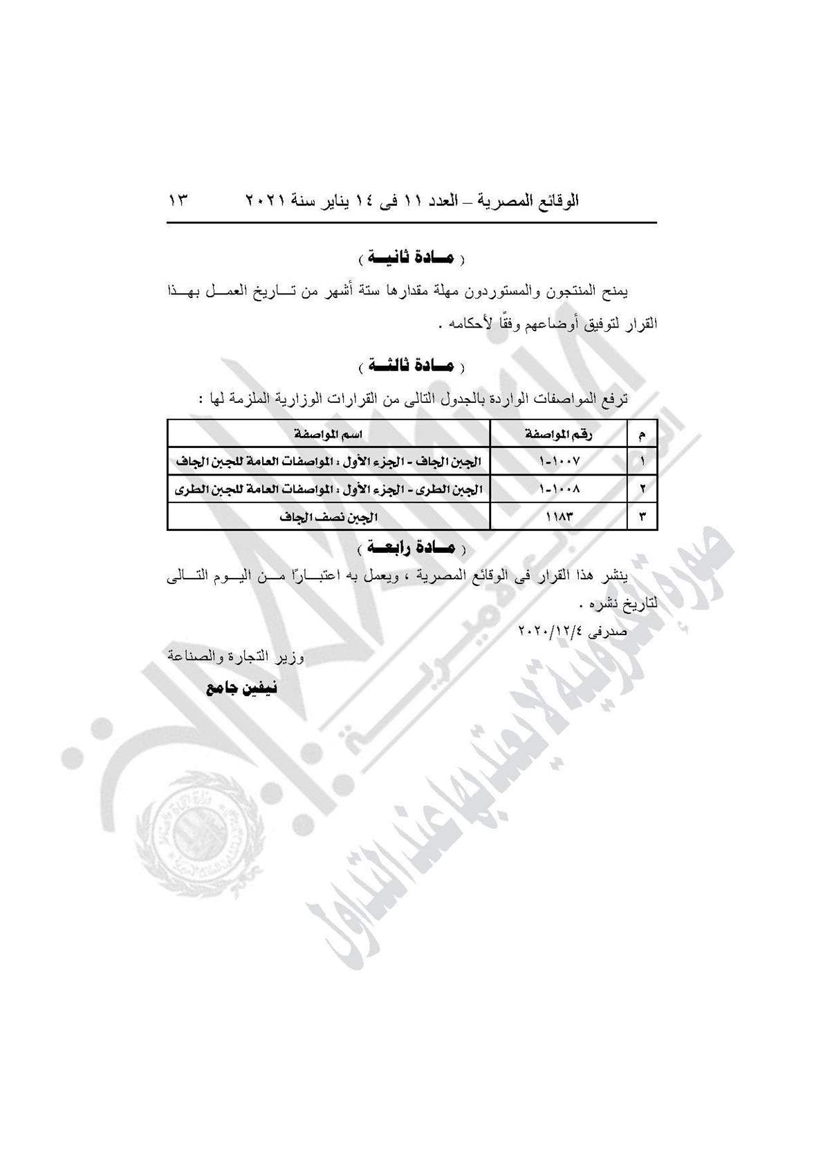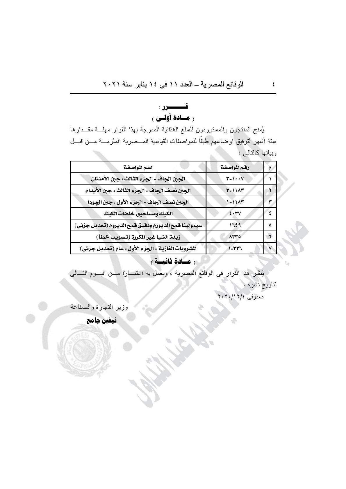 نشرت جريدة الوقائع المصرية في عددها رقم 11، الصادر في 14 يناير 2021، 7 قرارات لوزارة التجارة والصناعة بشأن منح المنتجين والمستوردين للسلع الغذائية (الجبن الجاف نصف الجاف جبن الامتنان ةالإيدام والجودا، والكيك ومساحيق خلطات الكيك وسمولينا قمح الديورم ودقيق قمح الديورم وزبدة الشيا والمشروبات الغازية) والسلع الهندسية والكيماوية مهلة 6 أشهر لتوفيق أوضاعهم.