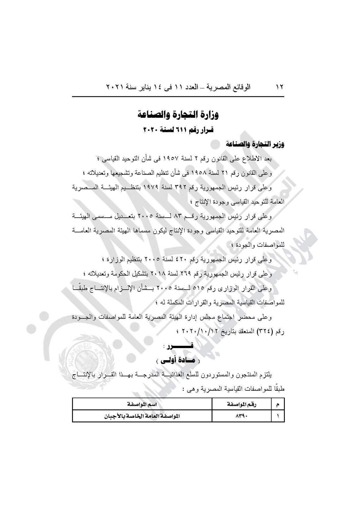 والقرار رقم 611 لسنة 2020، بأن يلتزم المنتجون والمستوردون للسلع الغذائية المدرجة بهذا القرار بالإنتاج طبقًا للمواصفات القياسية المصرية.