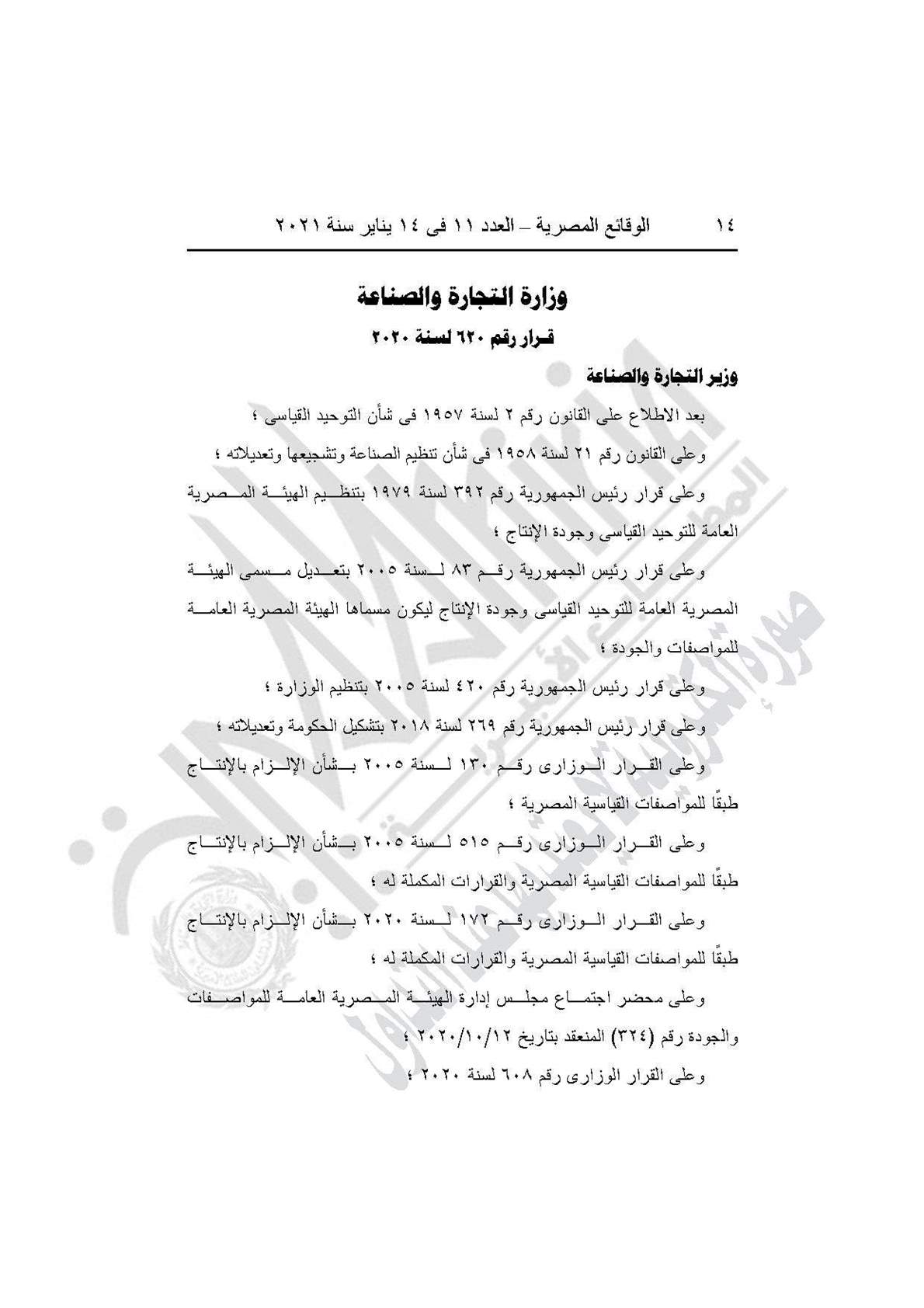 والقرار رقم 610 لسنة 2020، بإلزام المنتجين والمستوردين للسلع الهندسية والكيماوية بالمقاييس المدرجة بهذا القرار طبقًا للمواصفات القياسية المصرية.