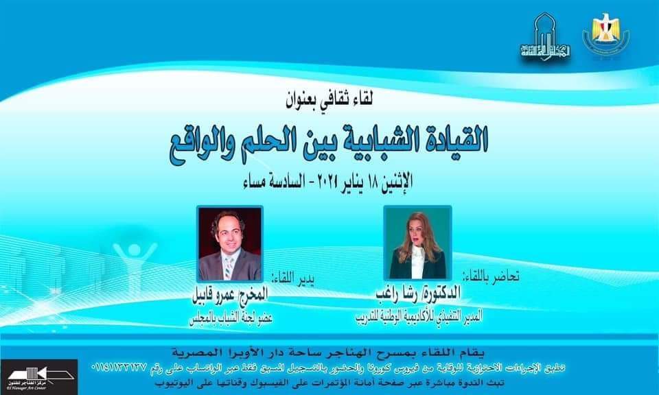 وتحاضر باللقاء الدكتورة رشا راغب المدير التنفيذي للأكاديمية الوطنية للتدريب، ويدير اللقاء المخرج المسرحي عمرو قابيل عضو لجنة الشباب بالمجلس، كما يتضمن حوار مفتوح مع عدد من شباب المثقفين.