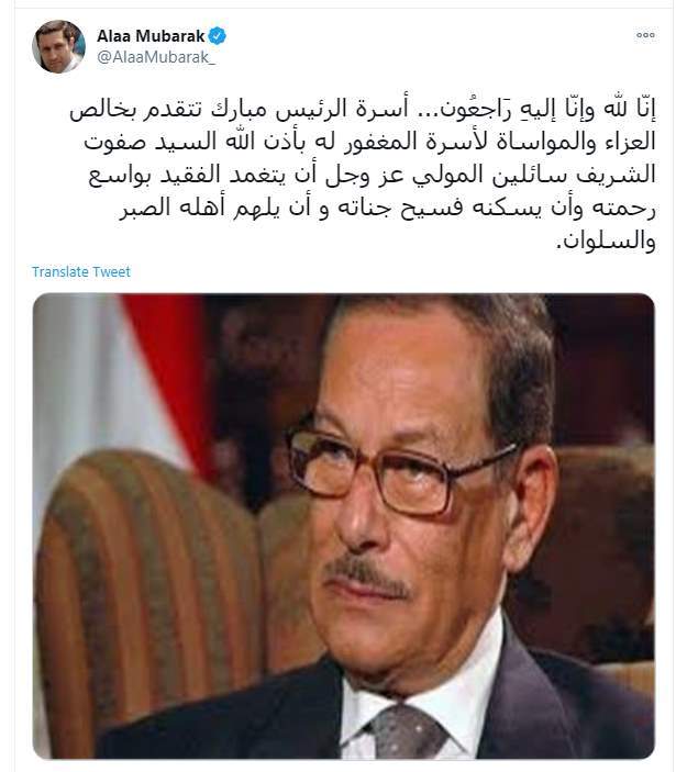 وكتب علاء مبارك تغريدة على "تويتر": "إنّا لله وإنّا إليهِ راجعُون.. أسرة الرئيس مبارك تتقدم بخالص العزاء والمواساة لأسرة المغفور له بإذن الله السيد صفوت الشريف، سائلين المولي عز وجل أن يتغمد الفقيد بواسع رحمته وأن يسكنه فسيح جناته وأن يلهم أهله الصبر والسلوان".