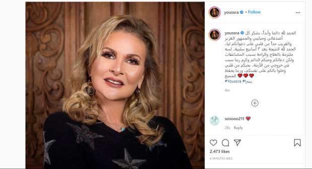 وقالت يسرا عبر حسابها على موقع تبادل الصور والفيديوهات "إنستجرام": "الحمد لله دائما وأبدًا.. بشكر كل أصدقائي وحبايبي والجمهور العزيز والقريب جدًا من قلبي على دعواتكم ليا.. الحمد لله النتيجة بعد ٣ أسابيع سلبية".