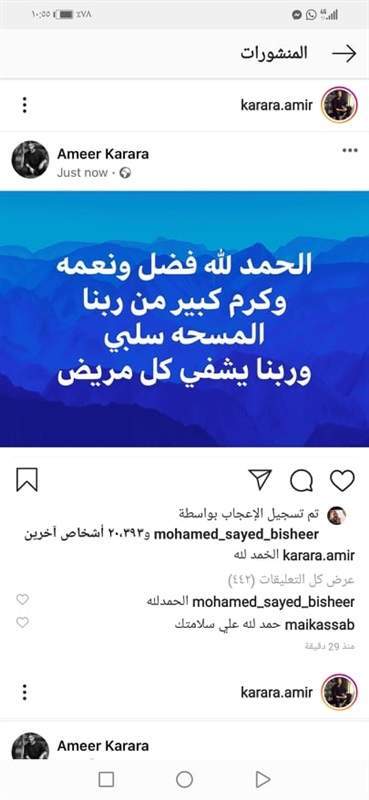 وأعلن الفنان أمير كرارة عن تعافيه التام من فيروس كورونا بعد سلبية المسحة الطبية الخاصة به، وكتب عبر حسابه الشخصي بـ "إنستجرام": "الحمد لله فضل ونعمة وكرم كبير من ربنا المسحة سلبي وربنا يشفي كل مريض"، وكان أمير قد أصيب بفيروس كورونا نهاية شهر ديسمبر الماضى.