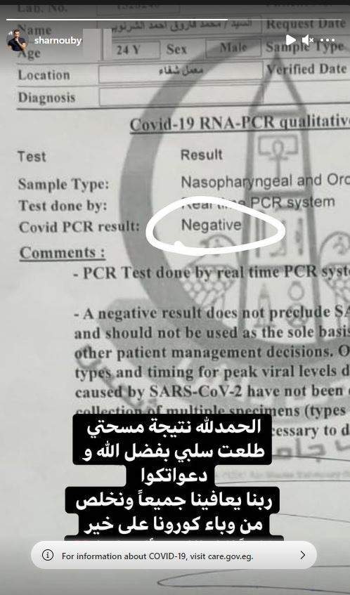 أعلن كل من الفنان محمد الشرنوبي وزوجته راندا رياض تعافيهما من الإصابة بفيروس كورونا، وشارك الشرنوبي نتيجة اختبار فيروس كورونا عبر خاصية "إستوري" بـ"إنستجرام" على حسابه الشخصي، معلقا: "الحمد لله نتيجة مسحتي طلعت سلبي بفضل الله ودعواتكم، ربنا يعافينا جميعًا ونخلص من وباء كورونا على خير".