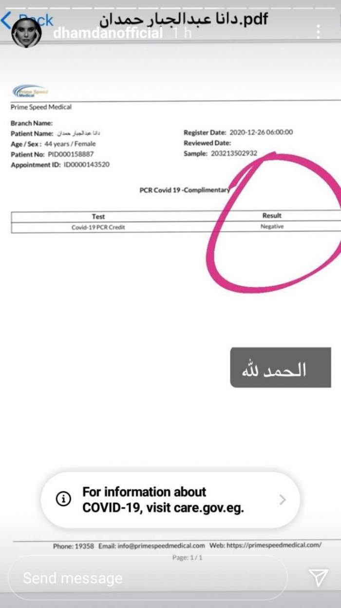 كما أعلنت الفنانة دانا حمدان تعافيها من فيروس كورونا، مؤكدة سلبية المسحة الطبية الخاصة بها، حيث نشرت عبر خاصية ستوري بحسابها بموقع "إنستجرام"، صورة نتيجة المسحة الطبية الخاصة بها، معلقة عليها قائلة: "الحمد لله".