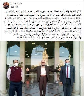 وأعلن الفنان مجدي صبحي، الشقيق الأكبر للفنان محمد صبحي، شفاءه من فيروس كورونا، وقال عبرحسابه الشخصي بموقع التواصل الاجتماعي "فيس بوك: "أشكر الله أولا وأخيرًا على نعمة الشفاء من كورونا اللعين بعد صراع مع المرض لمدة 20 يوم عذاب أشكر كل من وقف بجانبي من قلوب رحيمة".