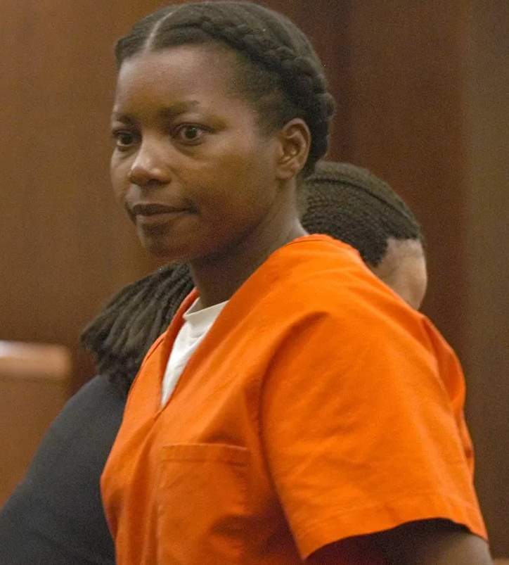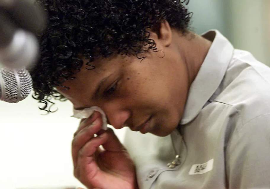 فرانسيس إيلين نيوتن، المحكوم عليها بتهمة قتل زوجها المنفصل عنها وطفليها، منذ أكثر من 17 عامًا، وهي تغادر قاعة المحكمة في هيوستن بعد تلقيها تاريخ إعدامها في 2004.