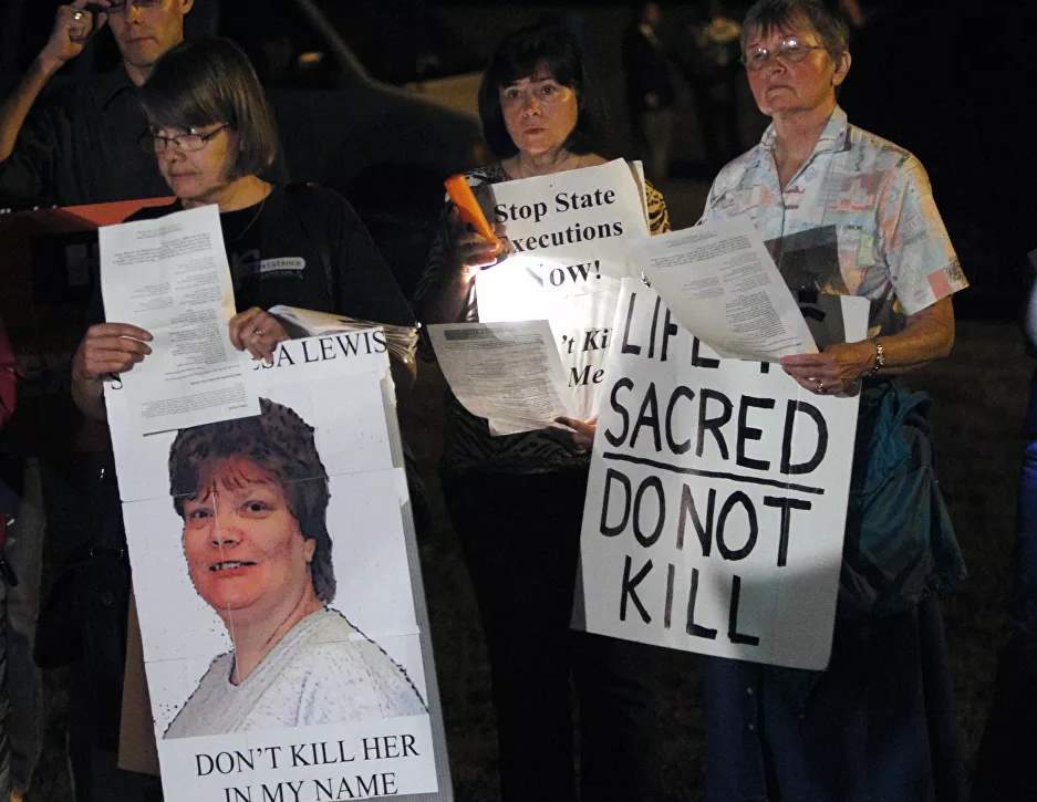 يظهر في الصورة متظاهرون ضد عقوبة الإعدام يحملون لافتات أثناء احتجاجهم على إعدام تيريزا لويس، خارج إصلاحية جرينزفيل في جارات بولاية فيرجينيا، الخميس الموافق 23 سبتمبر 2010.
