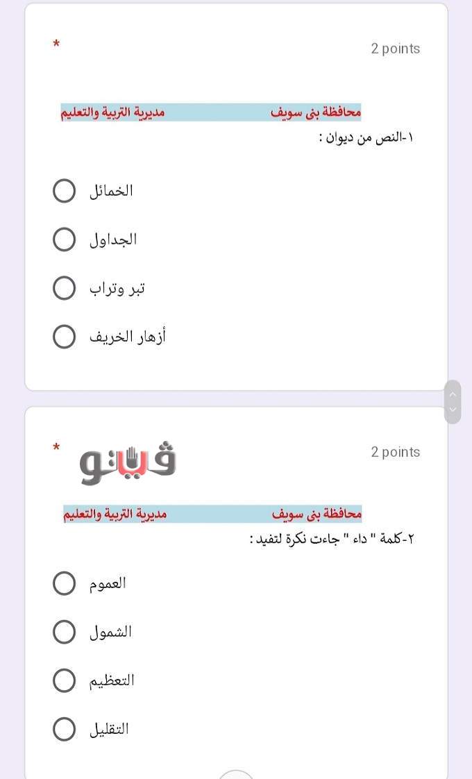 ويشمل ما تمت دراسته في الفصل الدراسي الأول 2020/2021م والذي سيتم إتاحته من خلال رابط إليكتروني يتم الإعلان عنه بالصفحة الرسمية للمحافظة على موقع التواصل الاجتماعي "فيسبوك" .