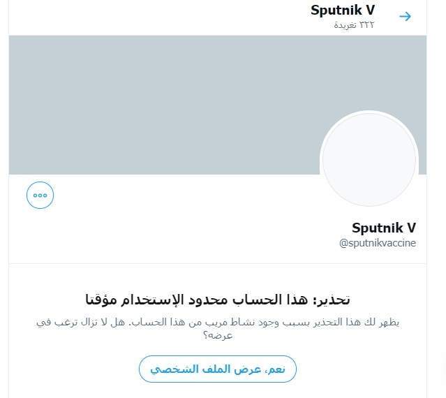 وظهر على صفحة اللقاح الروسي تنبيه من "تويتر"، قال إنه رصد "نشاطا مريبا" من قبل هذا الحساب.