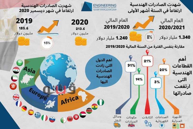 وكشف المجلس في تقرير له، أن الصادرات الهندسية سجلت ارتفاعا بنسبة 15% فى شهر ديسمبر 2020 لتبلغ 213.6 مليون دولار مقابل 185.6 مليون دولار خلال نفس الشهر من عام 2019.